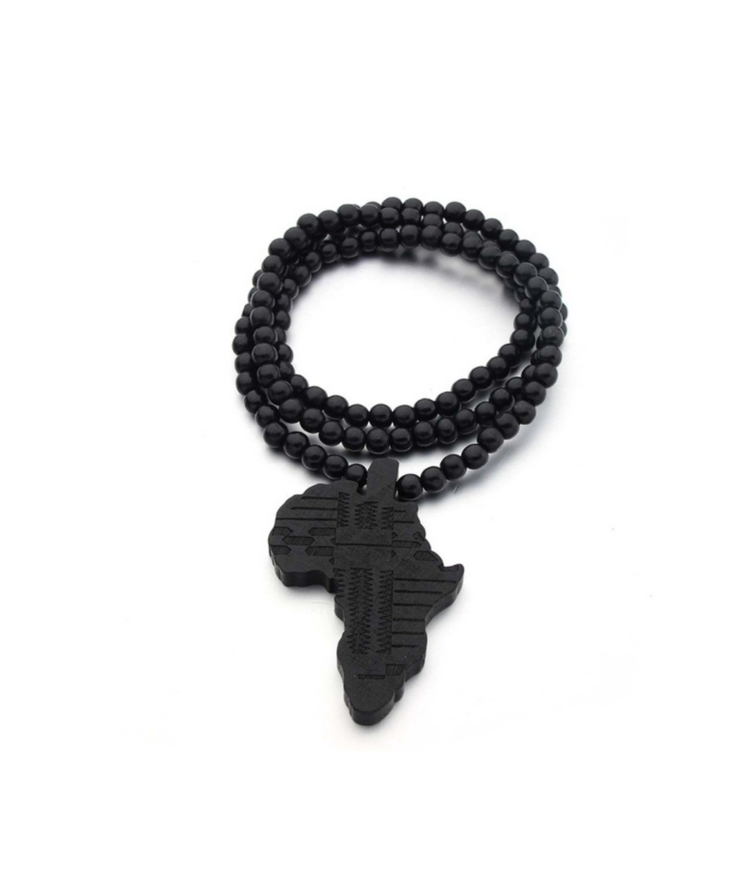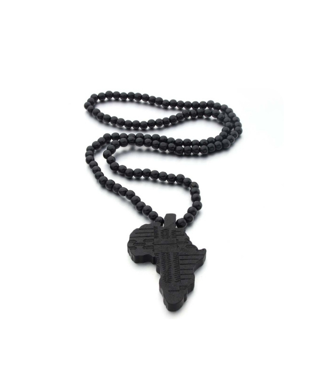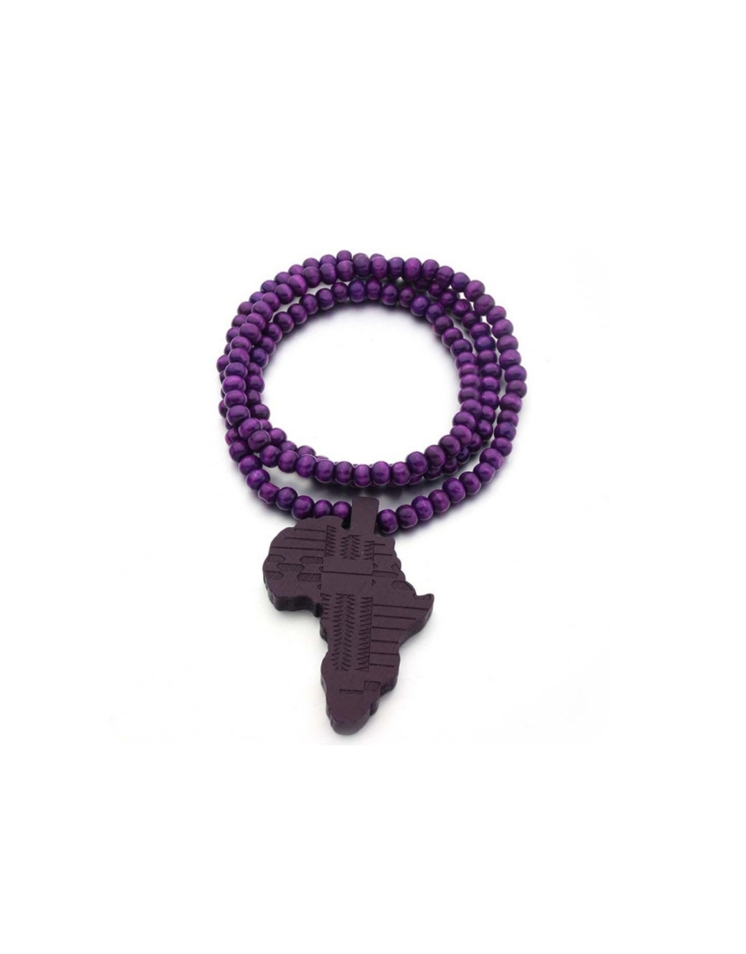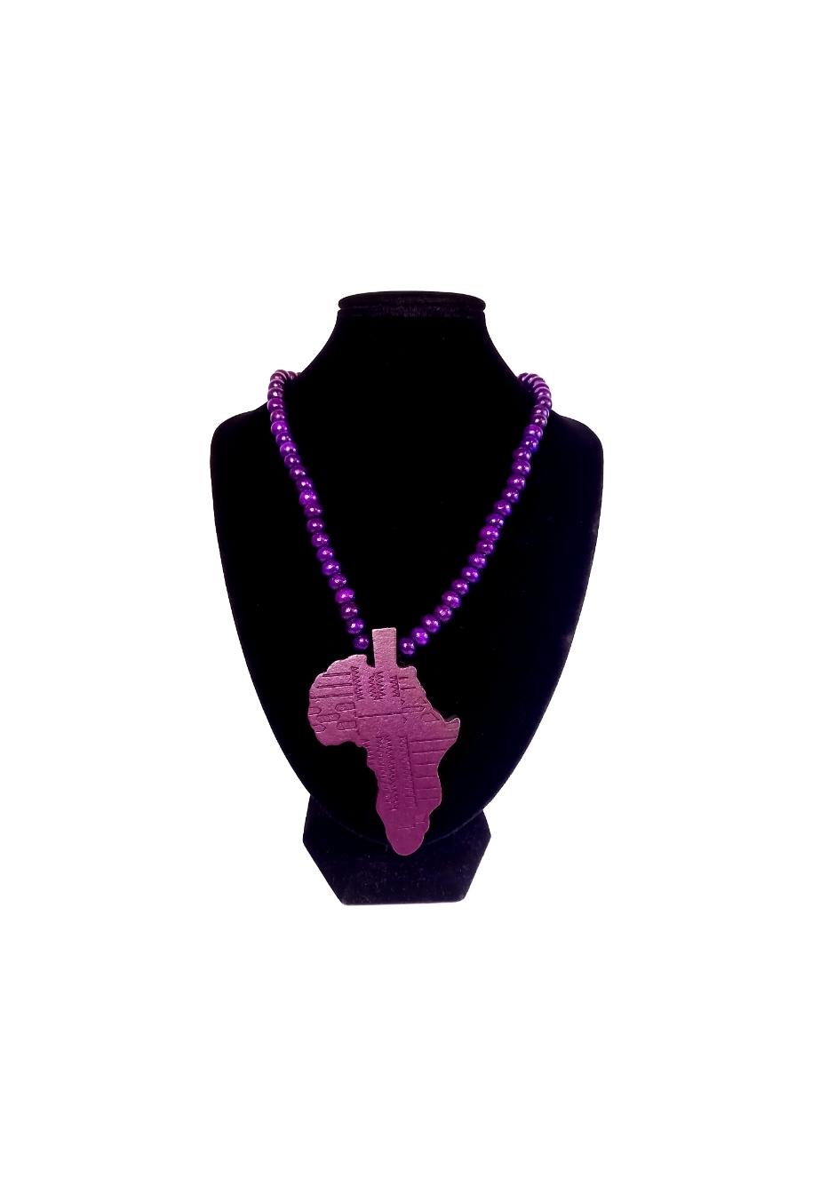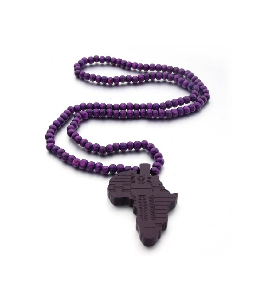 Halsbandet är gjort av träpärlor, hela halsbandet är 44cm lång, den finns i lila och svarta färger.