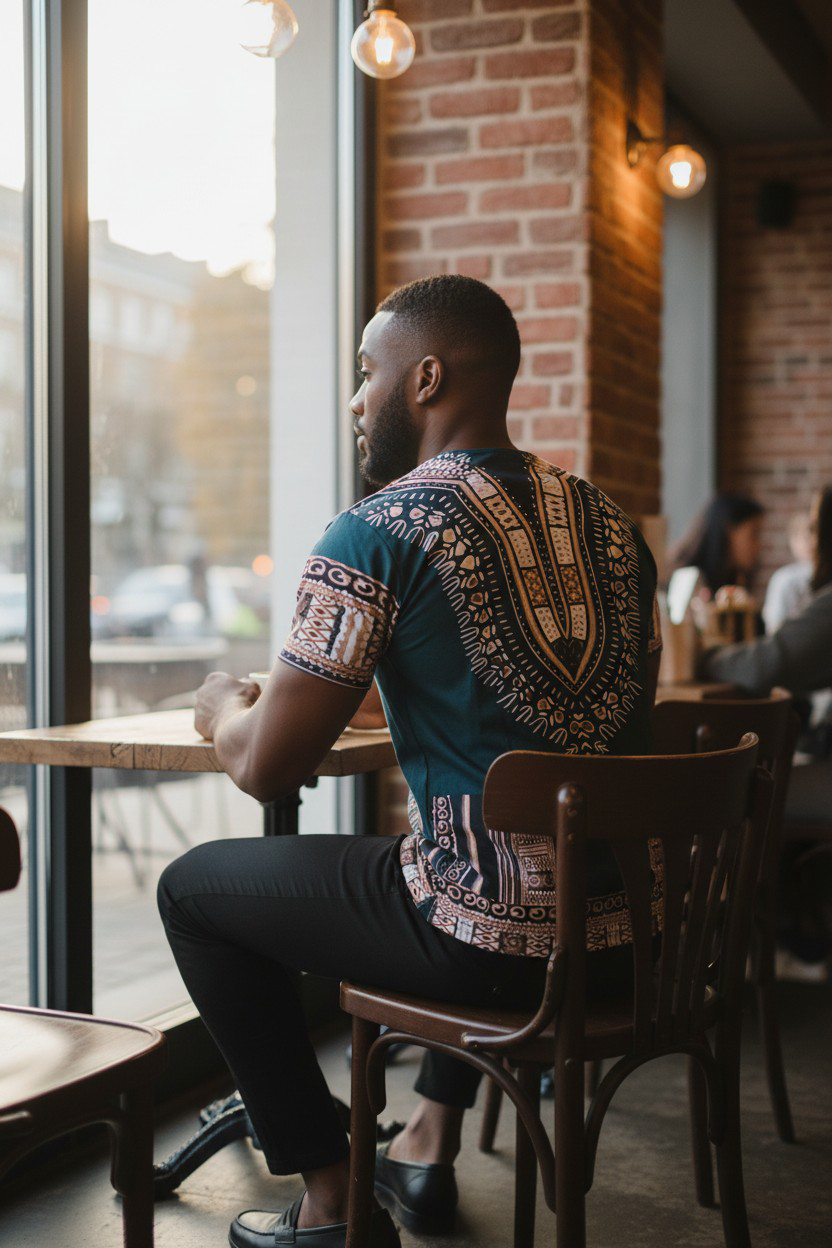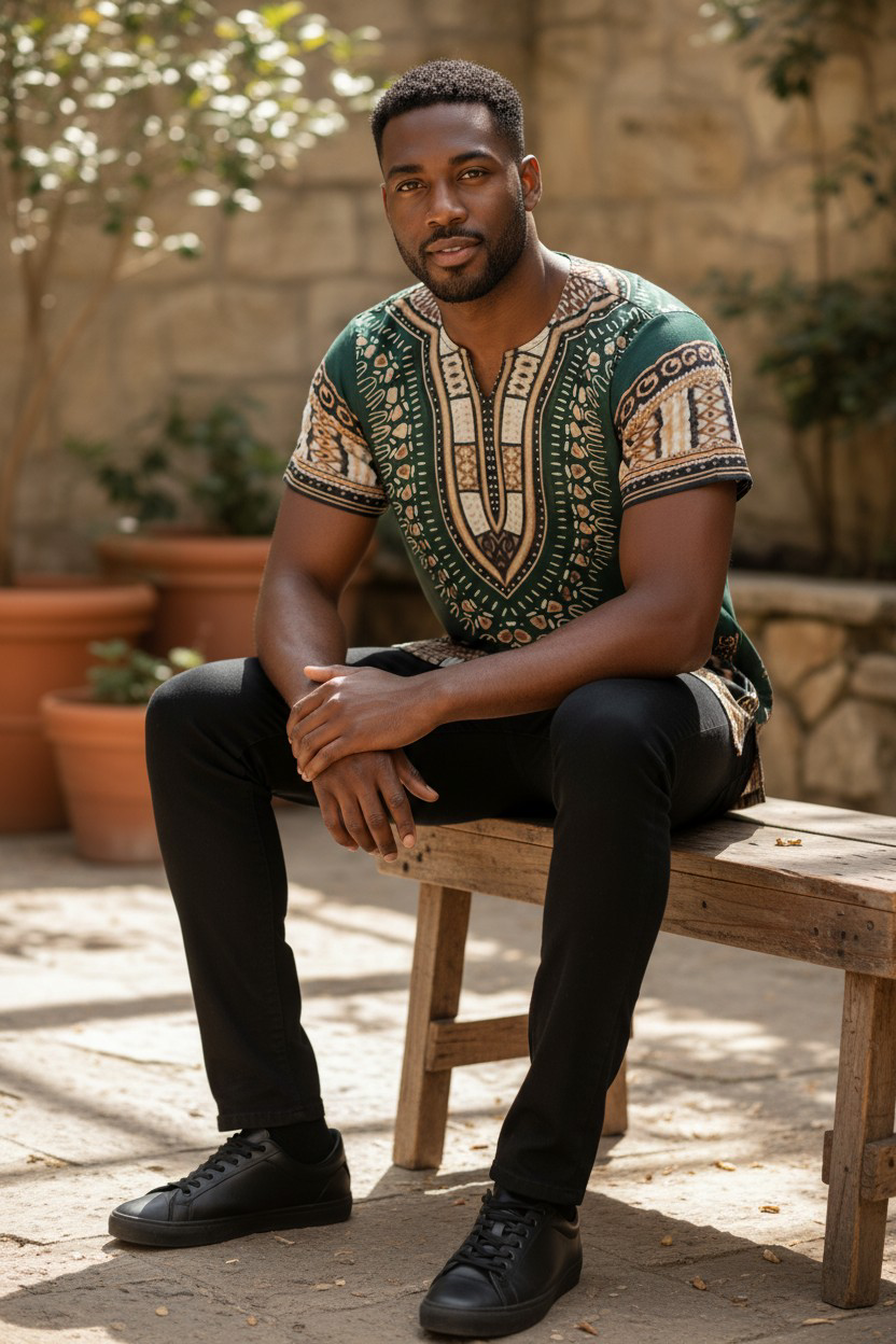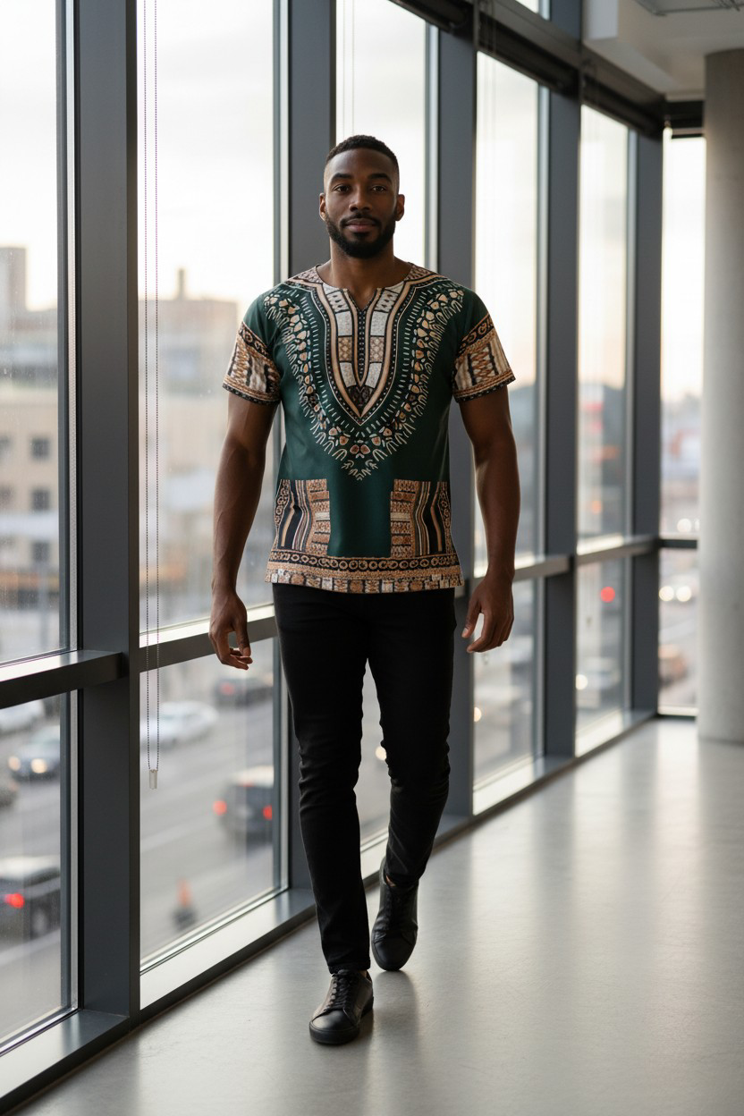 Elastisk Afrikansk tryck skjorta, skjortan har two fram fickor, är kortärmad, och Dashiki i stil. På grund av Skjortans elasticitet, den kan sitta tajt på din kropp beroende på din kroppsform.
