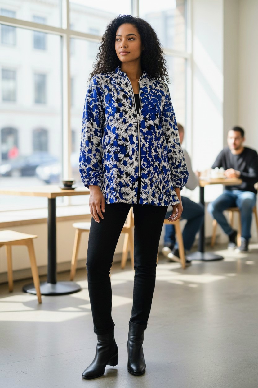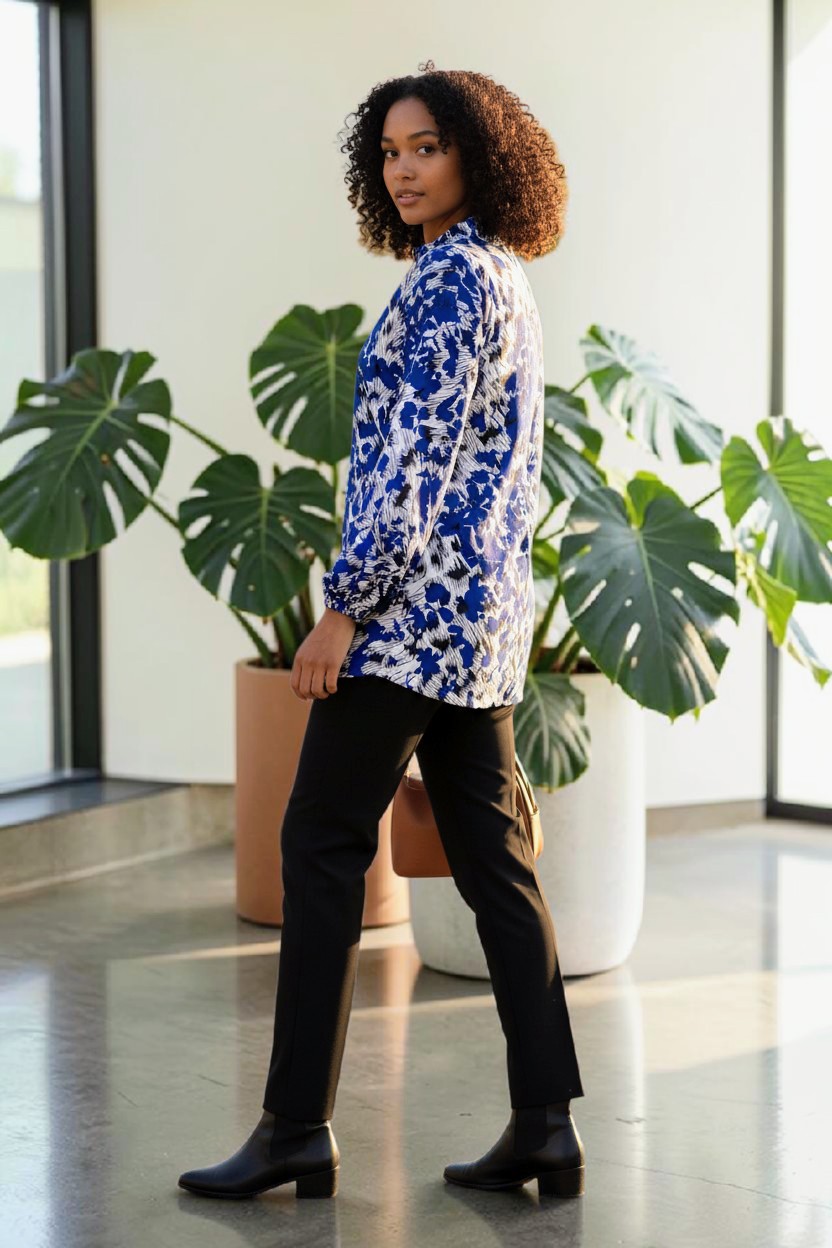 Afrikansk tryck långärmad blus. Blusen har puffiga ärmar med resår på armbotten, en henleykrage och dragkedja på framsidan.