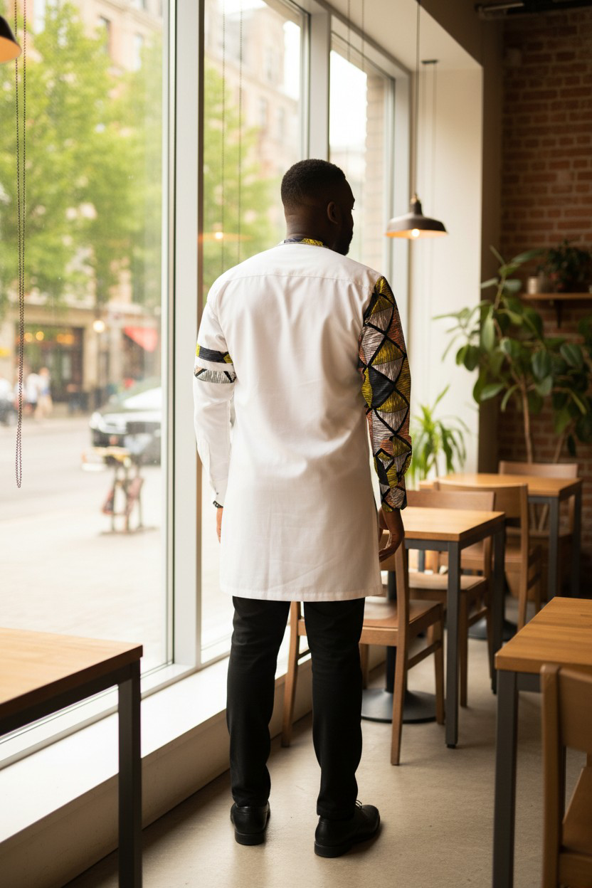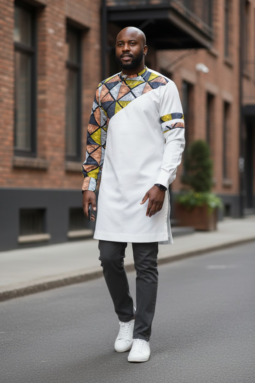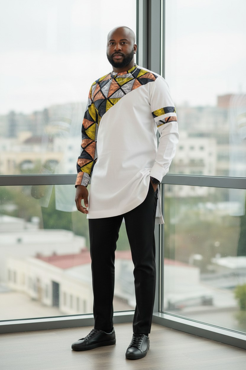 Förhöj din garderob med vår moderna Dashiki Skjortor för män, långärmad med en dragkedja på axeln och rund i halsen med två slitsar på sidan. Den här skjorta är en kombination av en Afrikansk tryck med en färg polyester tyg, vilket ger den en unik och elegant look för både vardagliga och formella tillfällen.