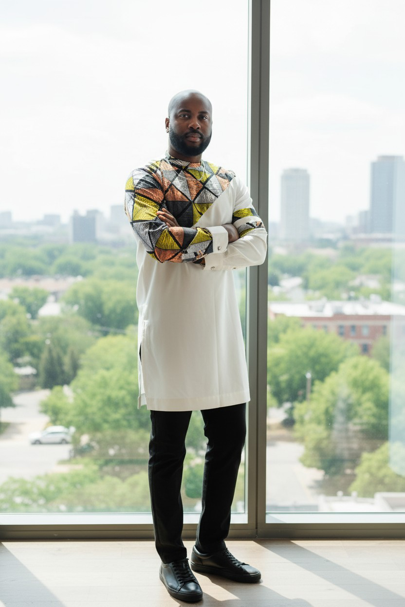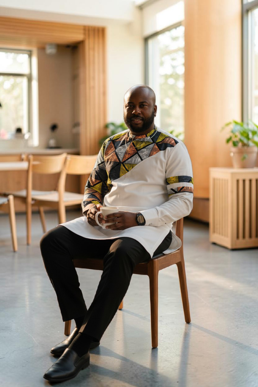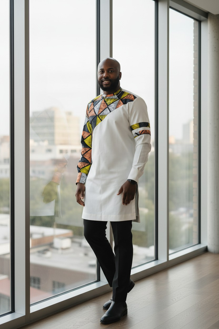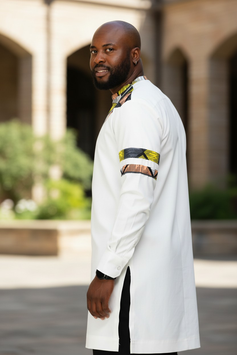 Förhöj din garderob med vår moderna Dashiki Skjortor för män, långärmad med en dragkedja på axeln och rund i halsen med två slitsar på sidan. Den här skjorta är en kombination av en Afrikansk tryck med en färg polyester tyg, vilket ger den en unik och elegant look för både vardagliga och formella tillfällen.