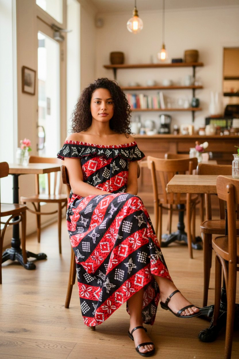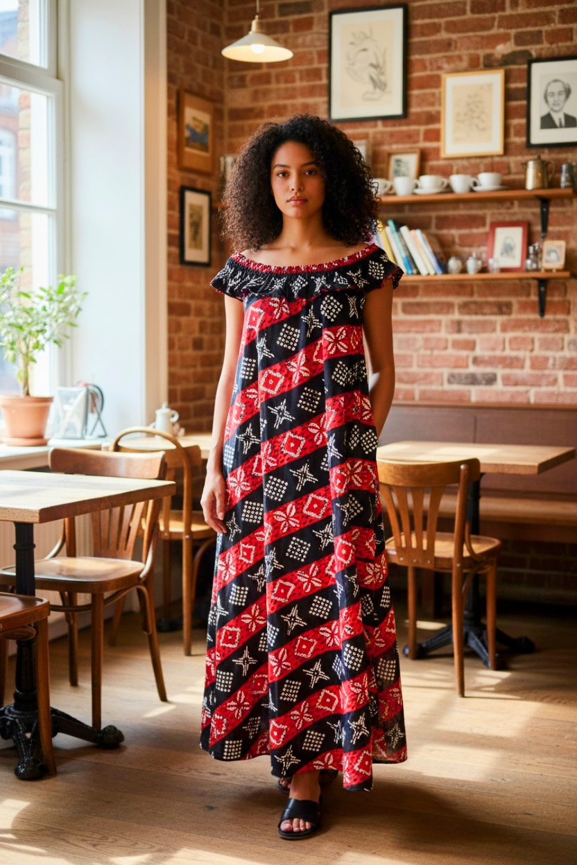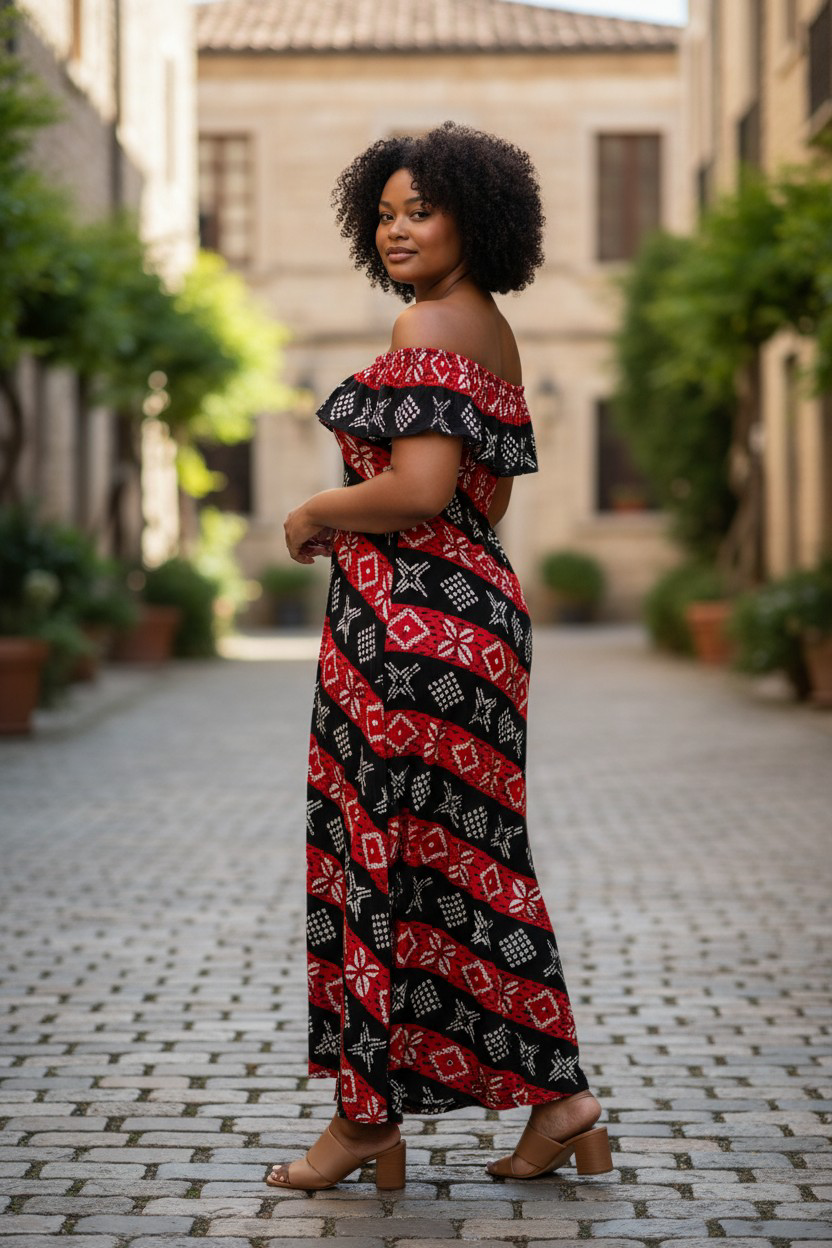 Den här klänningen är off-shoulder, och off-shoulder-delen är elastisk och flexibel. Klänningen har två fickor på sidorna.