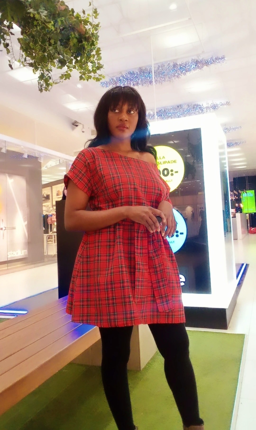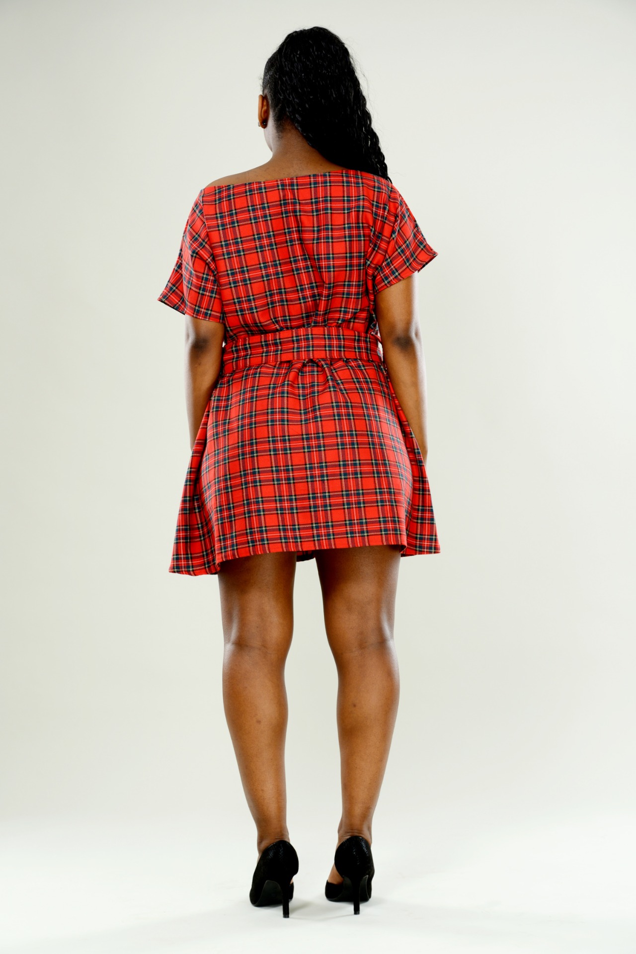 Rutig Scottish check klänning, Klänningen har kort ärmar och en överdimensionerad hals del som du kan styla som du vill. Bältet ingår på klänningen.
